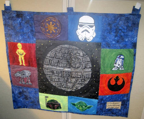 Beth is going to make sure her niece (due in January) starts out life with a good dose of Star Wars! She began this painted wall quilt with just the Death Star, but by the time it was done, eight other Star Wars icons were included. See more pictures at Craftster. Link -Thanks, Beth!