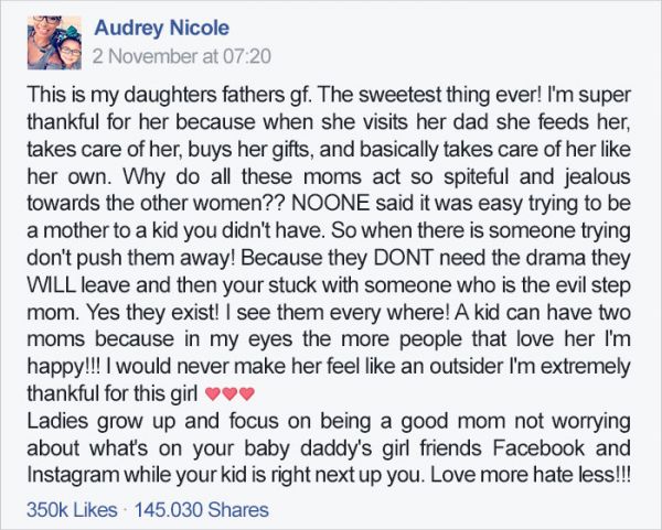 Audrey posted this heartfelt letter to her ex's new girlfriend on Facebook's Love What Matters Page along with the photo below, to express how grateful she is that the new gf is so sweet to her daughter Riley.