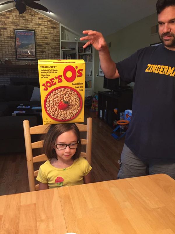 So far, the most Cheerios is 16 in a single stack, achieved by two dads so far. Demetrice Pollard worked for an hour to get 16 Cheerios stacked on his baby, and said the stack lasted for 2.5 seconds. No matter -as long as he managed to take a picture! Other submissions used multiple stacks, foods other than Cheerios, and there’s even one with a baby who’s wide awake! But this guy used his head.