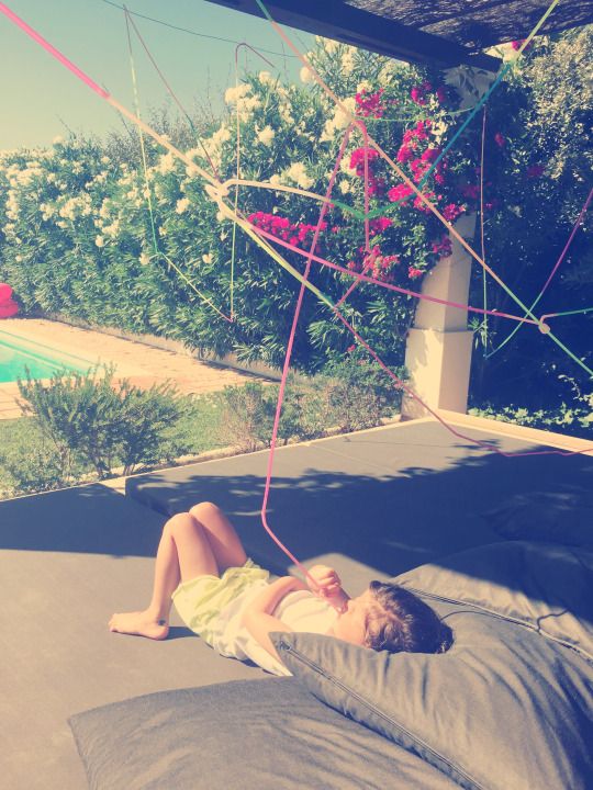 While she napped on garden pillows, he built from individual straws an enormous crazy straw fully 50 meters long. When she woke up, the tip was hanging over her. You can see more photos here.