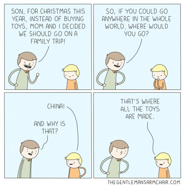 Did your family ever pull that “Instead of buying toys this year…” business with you? If you’re talking to a young child, you better be talking about going to Disneyland, where you’re sure to get souvenir toys. Getting a “family gift” like a new TV never quite cut it when all you ever heard from your friends and your old TV was toys, toys, toys. Once the kids are around ten or eleven, it just might work. This comic is from The Gentleman’s Armchair. -via reddit