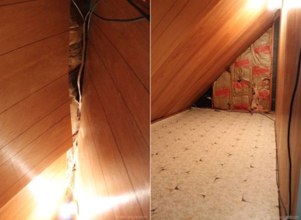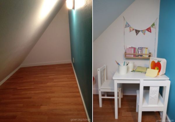 When blogger Sarah Goer and her husband purchased their home, they noted a small storage room connected to the bedroom they intended to use for their two-year-old son. Formed by a steep roof pitch next to the bedroom, the storage room was 7' by 12'. A tiny 2' by 4' door led to the small space. The couple hid the existence of the room from their son for two years, opting to place a dresser in front of the door.