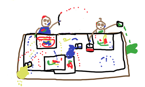 Scenario Two officially starts the moment they invent a new technique, like splattering paint across the paper or pouring it directly onto the paper. I always applaud these techniques. They are having fun! Creativity is messy!