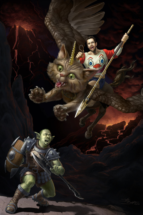 Wil Wheaton Riding a Kitten/Dragon/Unicorn into Battle against an Orc John Scalzi
