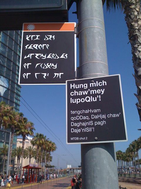 Okay, I'm normally pretty skeptical of government employees, but I've got to hand it to the City of San Diego: creating street signs in Klingon was a thoughtful and prudent touch for Klingon-speaking tourists attending Comic-Con.