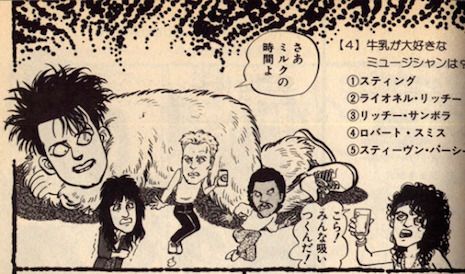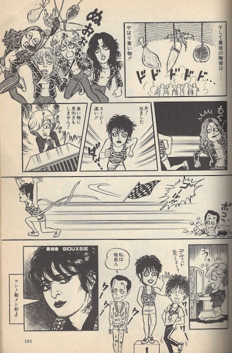These amazing illustrations are from a 1980s magazine called 8 Beat Gag, a magical manga mag where we can see Robert Smith transformed into some sort of yeti and Siouxsie Sioux beating Girlschool in a footrace.