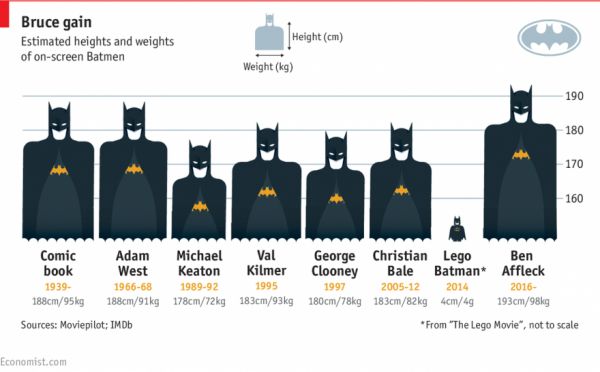 How tall and short has Batman been? The shortest is, surprisingly, not Michael Keaton from the 1989 movie. It was LEGO Batman--if he counts. This chart and article by The Economist describes how directors have compensated for the actors' varying heights and weights: