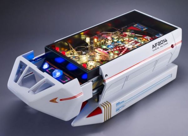 The master craftsmen at ALTAR Furniture, which previosly made an R2-D2 coffee table pinball machine, built this coffee table body around an old Star Trek pinball machine dating back to 1991. The one-of-a-kind piece required 390 hours of work to make it into a Starfleet shuttlecraft, probably a Type 15 shuttlepod. The new LCARS display at the front includes truly otherworldy artifacts: 4 meteorites.