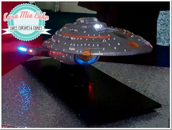Appropriate for a wedding cake, this edible model of the Voyager is moving forward at warp speed. You can tell from the lighted engine nacelles, which is only one of the fantastic illuminations provided by Cara Mia Cake. The deflector dish and exterior windows also light up the surrounding darkness of space. You can see more photos at Between the Pages.