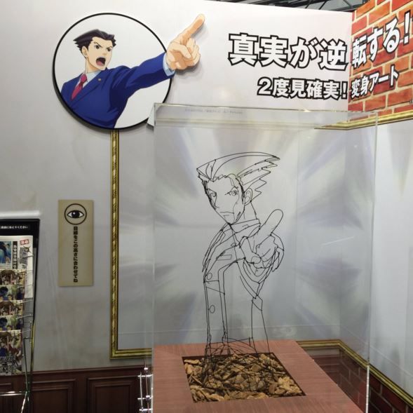 New seasons of the anime series Phoenix Wright: Ace Attorney and Detective Conan have begun. To promote them, an artist in Japan created this amazing anamorphic wire sculpture. From this direction, it looks like Phoenix Wright . . .