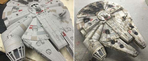 Tristan added damage and distress details to the otherwise dull gray ship, and with each new added detail another piece of the puzzle of how the Falcon ended up on Jakku falls into place.