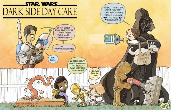 Artist Jay Fosgitt composed this image on commission. The sandbox looks a little dangerous. An unwary tyke could get stuck there, slowly digested for a long time out. At least Han has a way out.