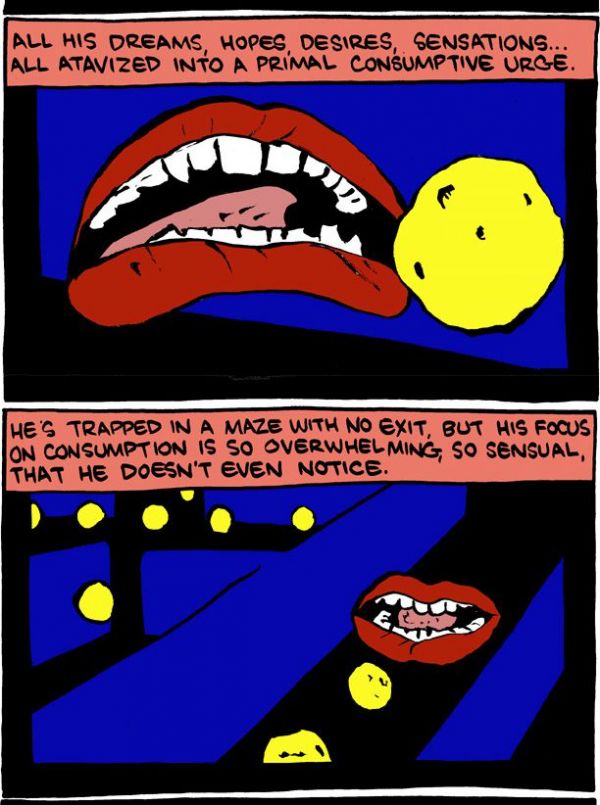 Turns out I've had the tale of that Pac attacker all wrong since childhood, because according to this radical strip by SMBC comics the Pac-Man storyline is “like Kafka wrote a Lovecraft story”.