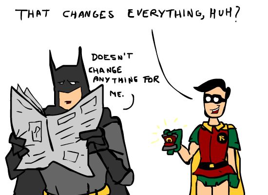 The Supreme Court decision to legalize same-sex marriage across the U.S. is causing a few awkward moments. The most common joke is about commitment-phobic partners who are suddenly put on the spot about marriage. A 3-year-old Key and Peele routine illustrates that perfectly. In the scenario above, it’s a case of crossed signals and dashed hopes. Poor Robin! This is from the webcomic BatsVsupes. -via Geeks Are Sexy