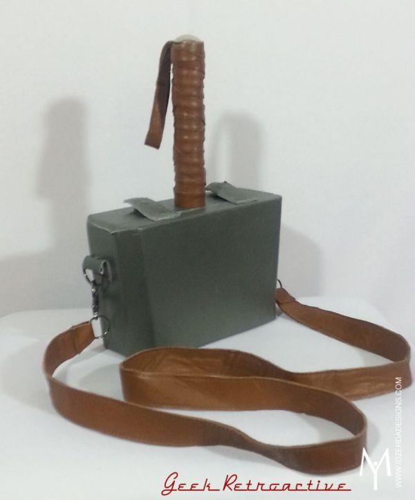 Thor is now, by the way, a woman. So it’s appropriate that she equip herself for battle. Mjolnir, the hammer of Thor, takes the form of a practical purse in this creation by Meryle Idzerda. It’s made around a cigar box and covered with lambskin leather that has a gunmetal finish.