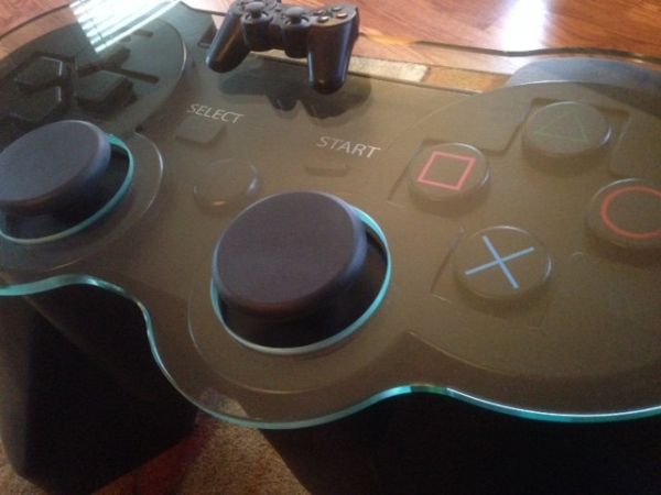 That's a real PS3 controller resting on a perfectly crafted replica that serves as a table. It's not functional, but it will certainly impress gamers who visit your home. Scott Blackwell, a woodworker in South Carolina, made it. He's offering the table for sale on Etsy.