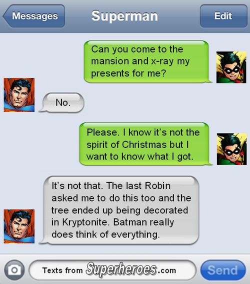 Diana McCallum and Andrew Ivimey write Texts from Superheroes, a funny blog consisting of screenshots of text messages between superheroes. It's the Christmas season, so your friends in the DC universe are decorating, sharing presents, and planning Christmas parties. They suffer a lot of the same stresses and problems that we ordinary people do.