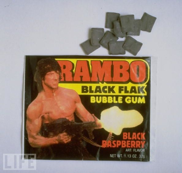 Rambo does all of his talking with his weapons, and he apparently chews Black Flak gum while blasting the bad guys! Want to be just like Rambo, kiddies? Chew a pack of Black Flak all at once and feel the Sly Stallone energy coursing through your veins!