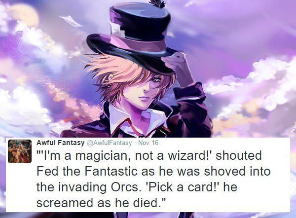 The Awful Fantasy Twitter account is full of horrible excerpts from fantasy stories that weren't actually written and will thankfully never make it into print, and just like smoking pipeweed it's easy to know your limits.