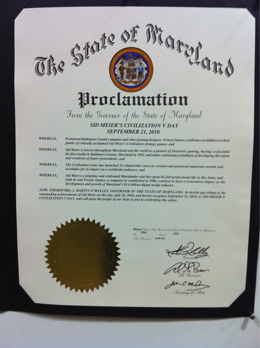 "Now, therefore, I, Martin O'Malley, Governor of the State of Maryland, do hereby pay tribute to the outstanding achievements of Sid Meier on this day, July 28, 2010, and hereby recognize September 21, 2010, as Sid Meier's Civilization V Day, and call upon the people of our State to join in celebrating this salute."