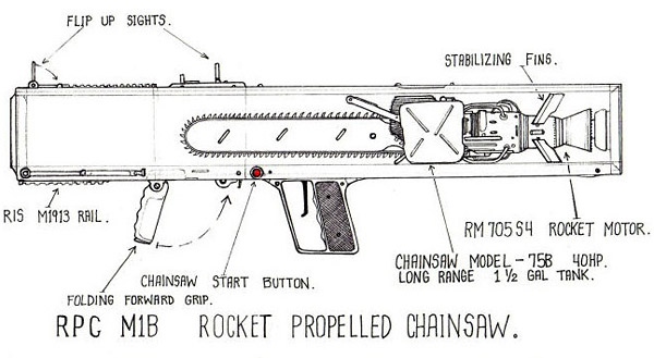 The Rocket Propelled Chainsaw (RPG M1B). Just gaze upon its awesomeness. I don't know who's responsible -- apparently this design has been floating around the Internet for while. But I suspect that engineer and regular commenter Jeff the Baptist is responsible. This design just screams "Jeff".