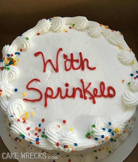 Jen Yates has several posts that highlight the best of 2016 at Cake Wrecks. This cake with "sprinkels" came from the post The Best Literal LOLs of 2016. Other best-of lists include cakes featuring the Best Misunderstandings of 2016, in which the decorator just took their best guess at what was wanted, and the Best NSFW Wrecks of 2016, some of which were on purpose.