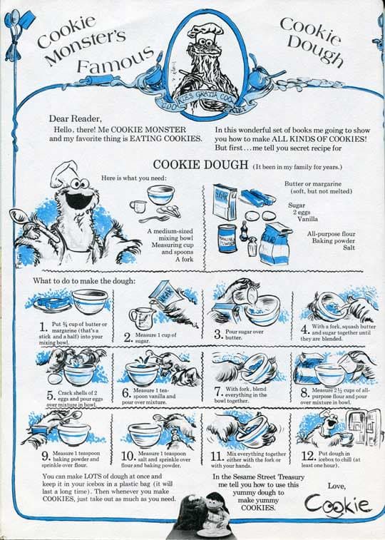Some time in the 1970s, we got a look at Cookie Monster’s favorite cookie recipe, when it was published in Big Bird's Busy Book. You don’t have to squint and read the page, because the recipe is typed out at The Kitchn. -via Nag on the Lake
