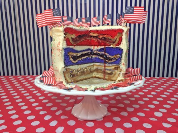 When the Fourth came around this year, the Vulgar Chef took advantage of the holiday by making the most American hot dog of all time -the Independence Dog. This delightful monstrosity takes a typical hot dog, wraps in bacon, then covers it in in ground beef. The meat log is then deep fried, covered in marinara sauce, mozzarella cheese and pepperoni and then served on a bun made of deep fried macaroni and cheese.