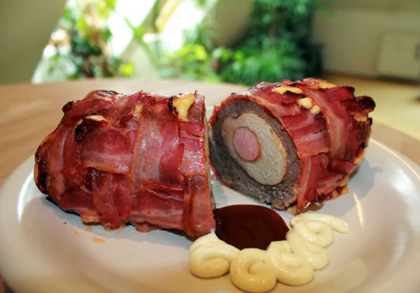 How do you like your hot dog? Just mustard, relish and sauerkraut isn't enough. Mirko of the German-language food blog Fat and Tasty built this delicious meal (translation) that almost looks too..., uh, good to eat. He began with a hot dog in a bun, which he then wrapped with sausage. Then he encased it a lattice of bacon, tomato paste, and Gouda cheese. Then Mirko popped it into the oven to produce this almost indescribable dish.