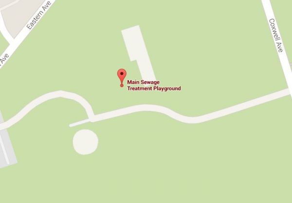This is a screenshot from Google Maps. It's not an error. This city park in Toronto is actually named the Main Sewage Treatment Playground. What fun things can you do at a place named "Main Sewage Treatment"? You can play baseball, rugby, ride a skateboard in its skating bowl, or ride a bike on the trail.