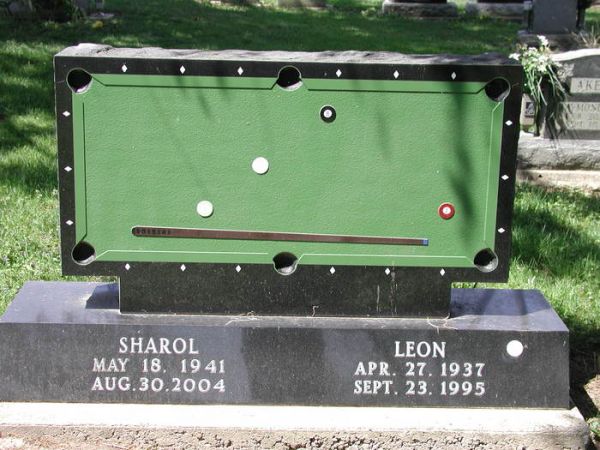 The gravestone for Leon and Sharon Gossett in Floral Hill Cemetery, Iroquois County, Illinois looks like a pool table. That's resting in both peace and style! All that's necessary is to pocket the last few balls and call the game.