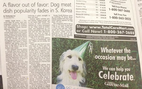Here is a perfect ad placement in what I would guess is the Gazette-Mail, a newspaper in Charleston, West Virginia. A recent Associated Press story informs us that dog meat has fallen out of fashion in South Korea. Eating dogs has been a tradition in that land dating back at least several centuries. But younger people increasingly tend to see dogs as pets.