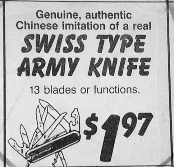 Who could resist this ad for a Swiss army knife on sale! It may be an imitation, but it’s a genuine and authentic imitation! Can't argue with the fact that it's cheap, though. -via Bad Newspaper