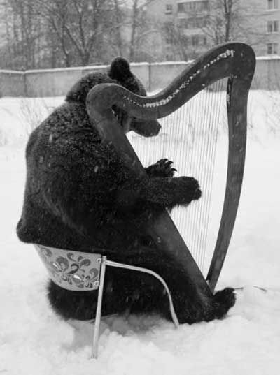 Russia makes sense as a point of origin, though. When it's that cold and snowy in Moscow, a harpist will both stay warm and draw attention by busking in a bear suit. And to own both a harp and a perfect bear suit, you have to get out and work every day. At least that's the story from the shallow reaches of my imagination. Can you come up with a better one? -via Arbroath