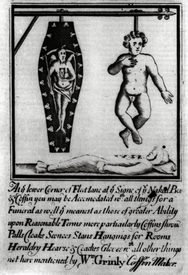 At ye lower Corner of Fleet Lane at ye Signe of ye Naked Boy & Coffin you may be Accommodated wth all things for a Funeral as well ye meanest as those of greater Ability upon Reasonable Terms more particularly Coffins Shrouds Palls Cloaks Sconces Stans Hangings for Rooms Heraldry Hearse & Coaches Gloves wth all other things not here mentioned by Wm.Grinly Coffin Maker.