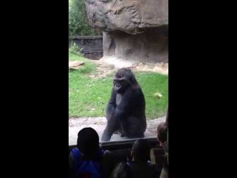 This reminds me of a gorilla named Samson they used to have at the Milwaukee Zoo, who would run up and smack the glass (very hard!), just to scare the bejeezus out of everyone.