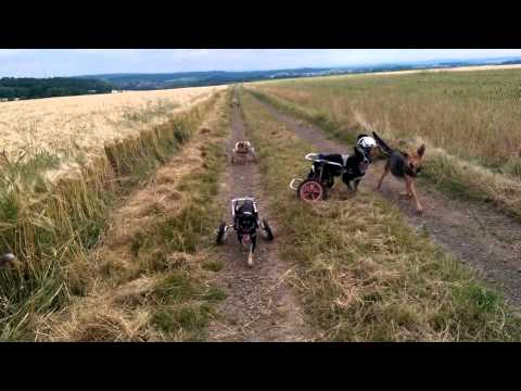 Gritta Goetz takes her dogs out to a field to play. 5 of the 8 dogs have wheeled carts for back legs. This slows them down a little bit, but they still have fun. They're a happy pack.