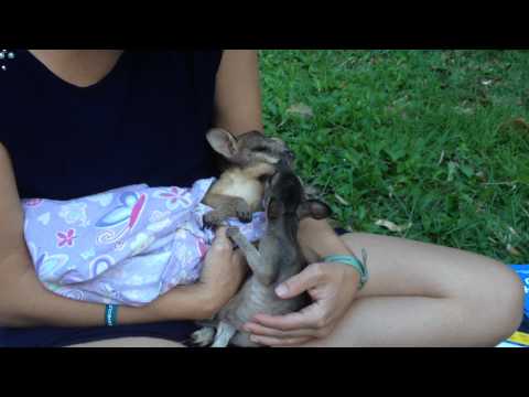 Two orphaned wallaby joeys named Gough and Salvador nuzzle and sniff each other as they meet for the first time on a crash course in wallaby friendship. The joeys are in the care of staff at Daintree Wonder Tours in North Queensland, Australia.