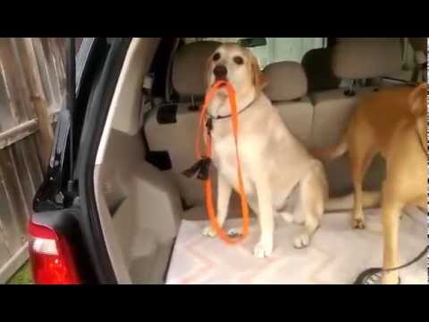 "Baxter loves going to the dog park and realized one day that I couldn't close the trunk with his leash hanging out. My jaw dropped the first time he pulled it in himself. Obviously, he isn't willing to wait for Pluto to come to the same realization."