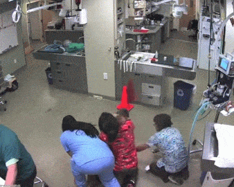 The remaining vet tech appears to crack up laughing.
