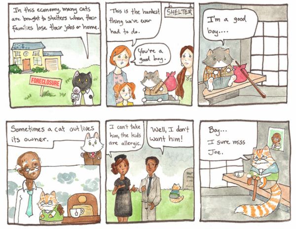 The cats from Breaking Cat News (previously at Neatorama) explain how cats wind up in animal shelters, and why some of them don’t get adopted. To illustrate, they follow five different cats who become homeless for five different reasons. At least 95% of those who read the whole story will need a hankie before it’s over, so be warned before you begin. But these cats have happy endings. So many shelter cats don’t. -via Metafilter