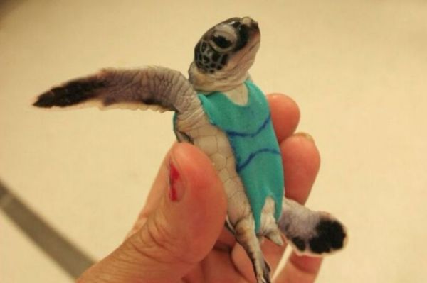 It's a stylish one piece suit with pair of stripes across the midriff to accentuate the body's lines. Why is this baby loggerhead sea turtle wearing it? Owen Coffee, a doctoral student at the University of Queensland built this swimsuit in order to hold a diaper on it. This is how Coffee and his colleagues will collect fecal samples, which are usually difficult to acquire from wild sea turtles. ABC News reports: