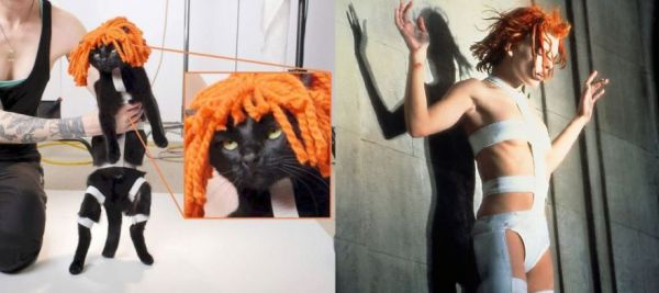 This is Khufu Beans, a cat owned by artist and pop culture commentator Comicbookgirl19. She loves to dress Khufu in custom costumes that look almost exactly like the original inspirations. In this case, Khufu is looking sharp in Leeloo's white strappy outfit from the science fiction movie The Fifth Element.