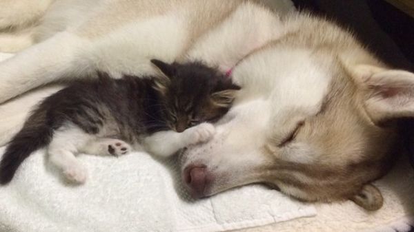 Back in 2014 we featured a husky that was raised around cats and thus, thought it was a cat, but as it turns out, we now know the opposite can be true too. Meet Rosie, a cat that was abandoned at only three weeks old and raised in a home with a surrogate mother husky who happens to be good friends with a few other huskies who live in the neighborhood. The kitty survived thanks to its surrogate family, but Rosie never learned what it's like to be a cat. Instead, she thinks she's just a slightly smaller dog.