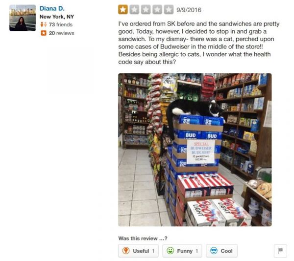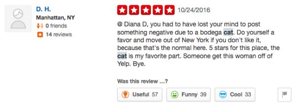 So if you have a problem with New York's Bodega cats take it from cat hater Diana D. and don't vent on Yelp or people will send the hate right back at you!
