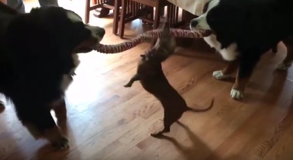 Kera is an 11-pound, 15-year-old dachshund. She decided she wanted in on a tug-of-war between two 100-pound Bernese mountain dogs pulling on a thick rope. Does little Kera stand a chance against these giants? She think she does!