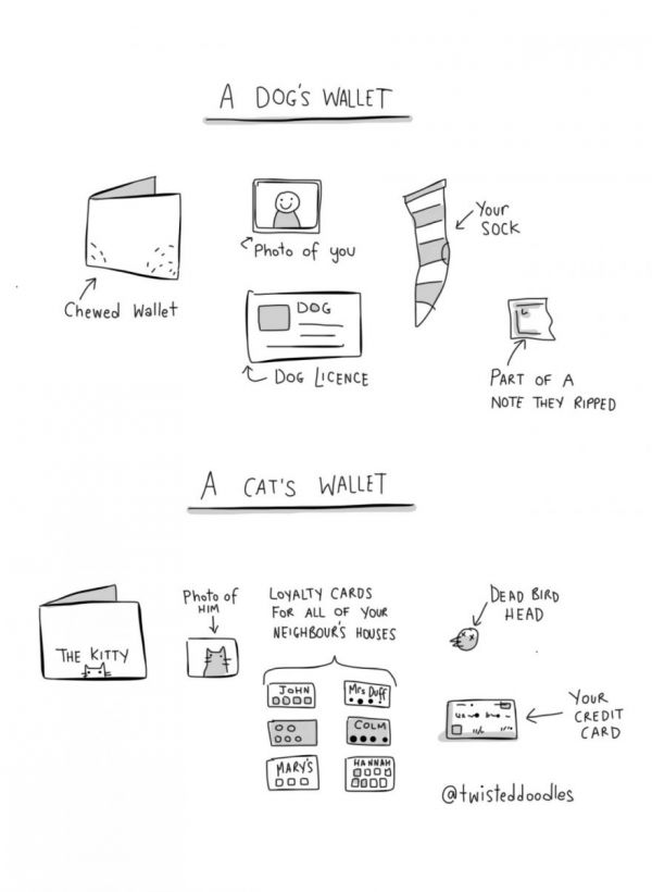 What's in your dog's wallet? His mind is always on you, so he carries appropriate mementos. What about your cat? Well, he's thinking about you, too. Just in a different way.