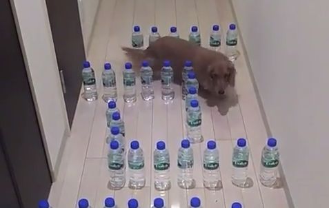 Chobi is a long-haired dachshund just trying to get through this water bottle maze his human left in the hallway. When he comes to a part he's not so sure about, there's a real problem backing up, because his body is too long to just turn around!