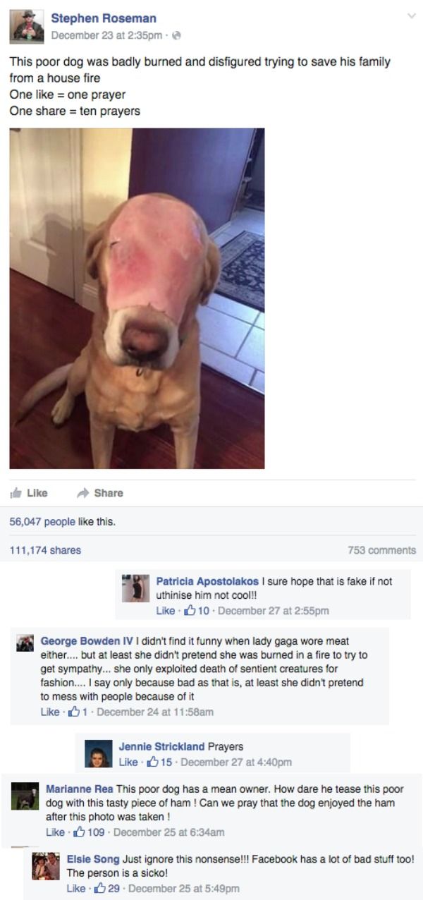 It all started when Stephen Roseman slapped a piece of ham on his dog's face and snapped a pic, posting it to Facebook with a silly caption asking people to pray for his dog via likes and shares.