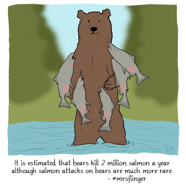Please welcome a cameo illustration by our pal @kristin, who we've twagged ourselves before.It is estimated that bears kill 2 million salmon a year although salmon attacks on bears are much more rare. - @mrsflinger